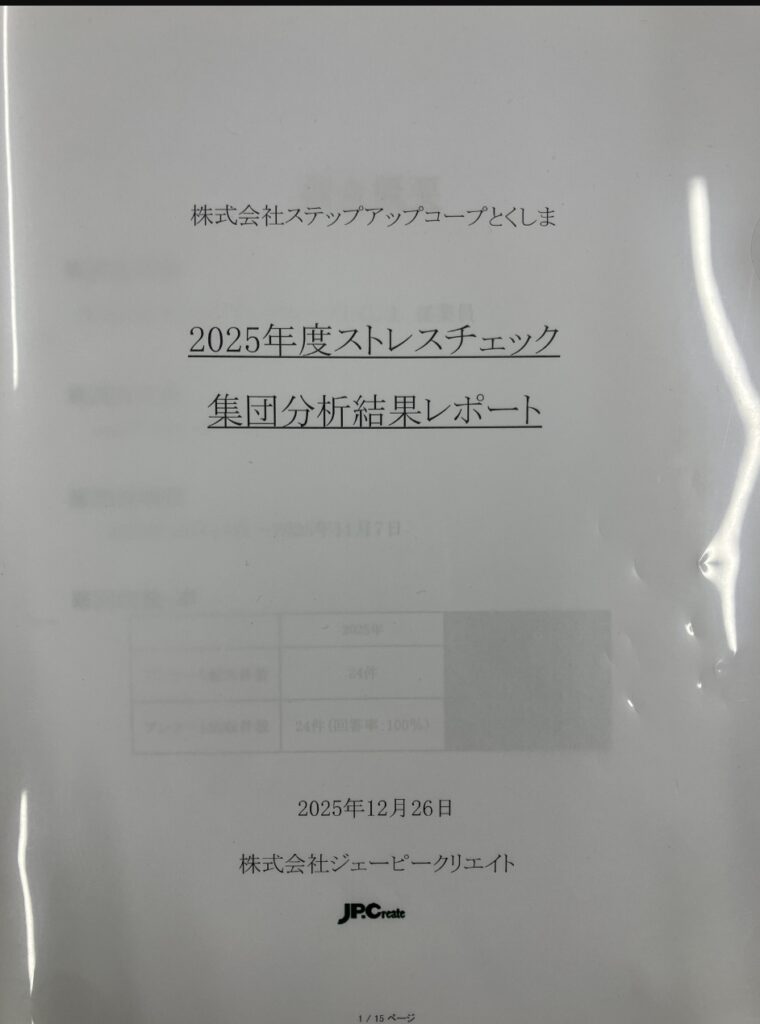 2026.01.09 ハートフルコープステップアップコープ就労継続支援B型事業所 ストレスチェックを実施しています ストレスチェックの中小事業者への義務化に先駆けて 弊社でも昨年度よりストレスチェックを実施しています < 前へ 一覧へ戻る カテゴリー ・すべて ・ハートフルコープ ・ステップアップコープ ・就労継続支援B型事業所 アーカイブ ・2026.01(2)・2025.09(1)・2025.08(4)・2025.06(1)・2025.05(2)・2025.04(1)・2025.03(1)・2025.02(4)・2025.01(7)・2024.12(1)・2024.09(2)・2024.08(1)・2024.05(2)・2024.03(5)